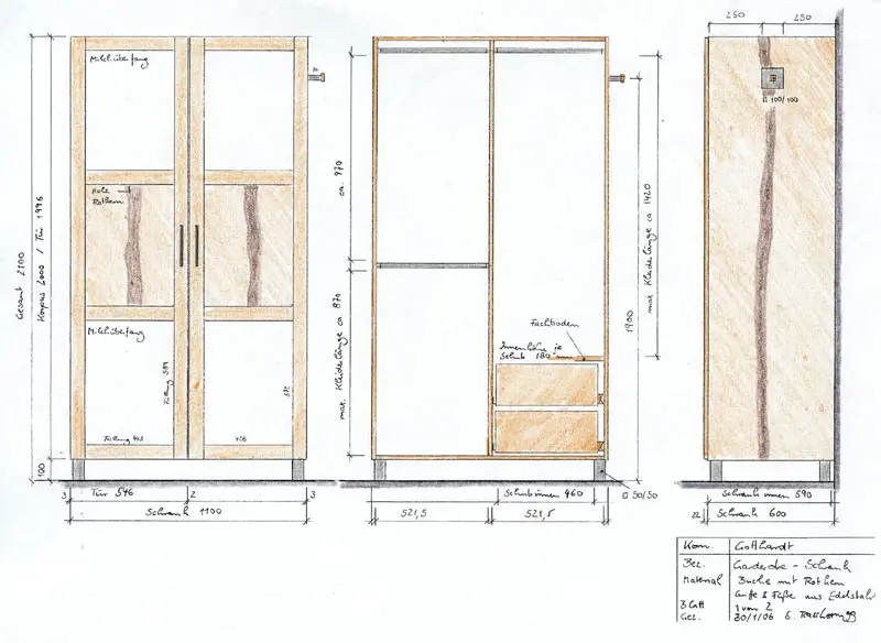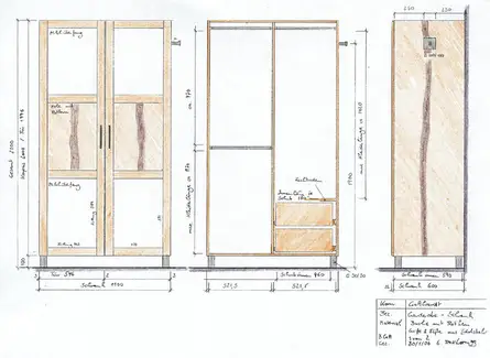 Wenn alles klar ist, erstellen wir aus dem angepaßten Angebot die Auftragsbestätigung und die Fertigungszeichnung (selbstverständlich haben wir die Maße Ihrer Räume dazu selbst gemessen), die Sie bitte sehr sorgfältig durchsehen. Denn jetzt lassen sich Mißverständnisse oder Fehler noch problemlos beheben. Und danach geht´s gleich los mit der Fertigung.
