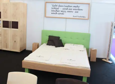 Das Bett mit dem grünen Lederkopfteil und den grünen Füßen war auf der Consumenta ein toller Hingucker. Das Bett ist aus Buche, hat ein Matratzenmaß von 180 x 200 cm und das Lederkopfteil schenken wir Ihnen dazu.
