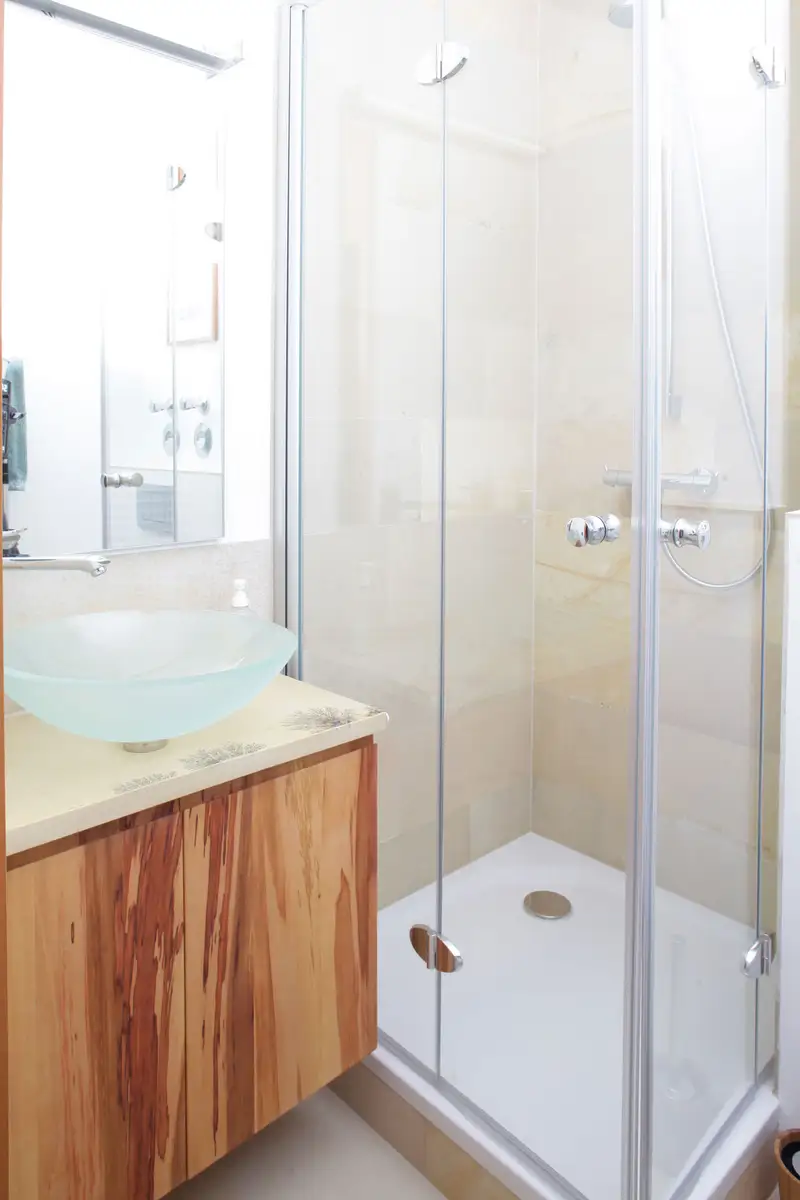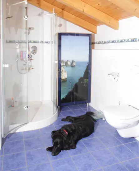 Die Frage nach der Schrankfront in der Problem-Nische neben der Dusche haben wir mit dem Lieblings-Urlaubsfoto unseres Kunden aus Portugal gelöst und dasselbe in ein Foto der Balkontür per Photoshop eingefügt.