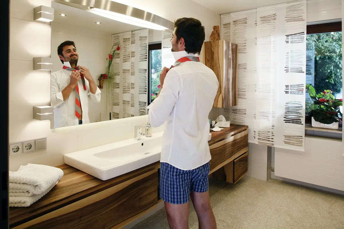 Weil der Franzose Julien Frandon gerade zu Gast war, haben wir ihn gleich als Model im Bad von Familie Herrmann eingesetzt. Also "Bad-boy" bitte mit "a" aussprechen, denn er ist ein Guter.