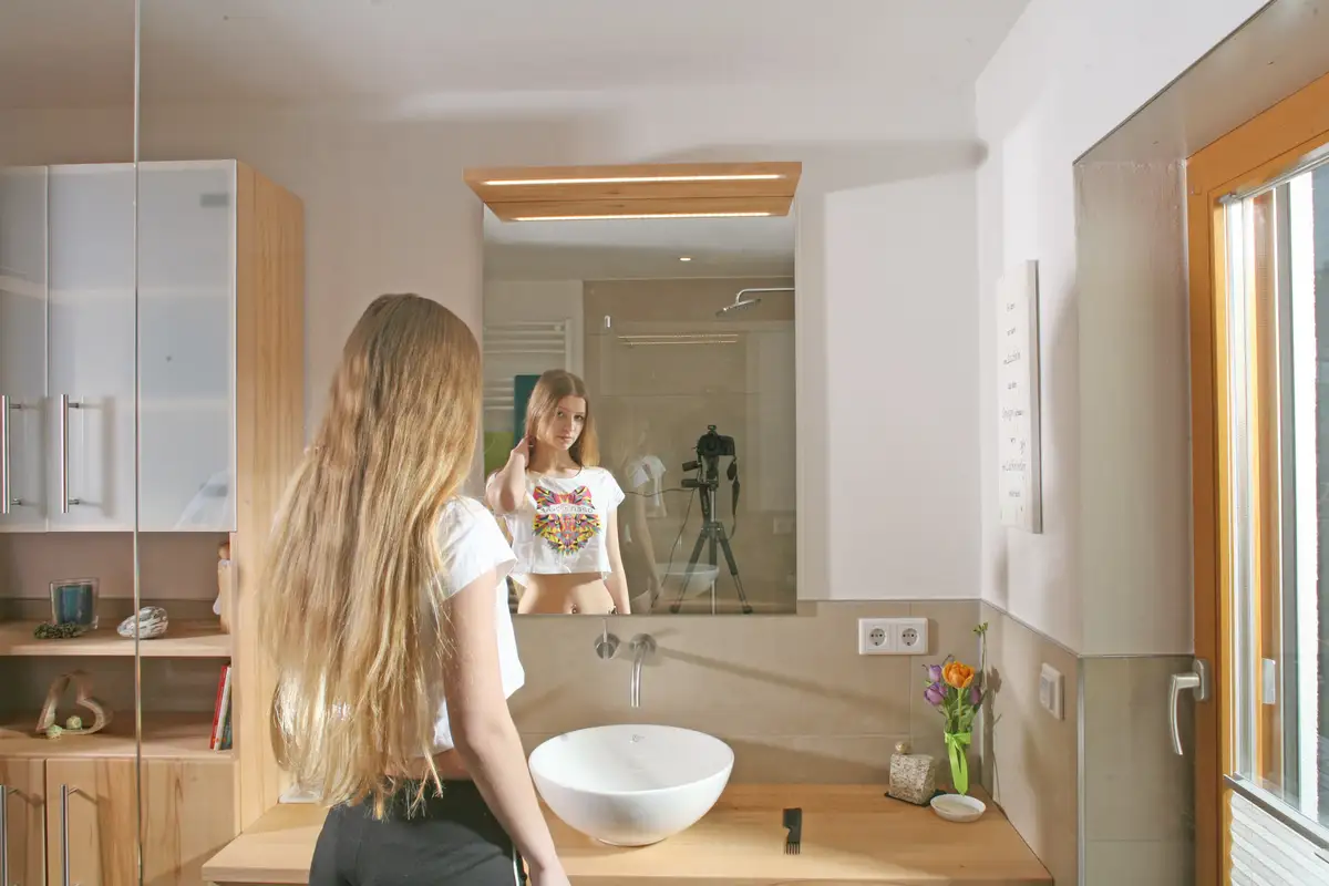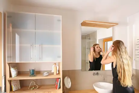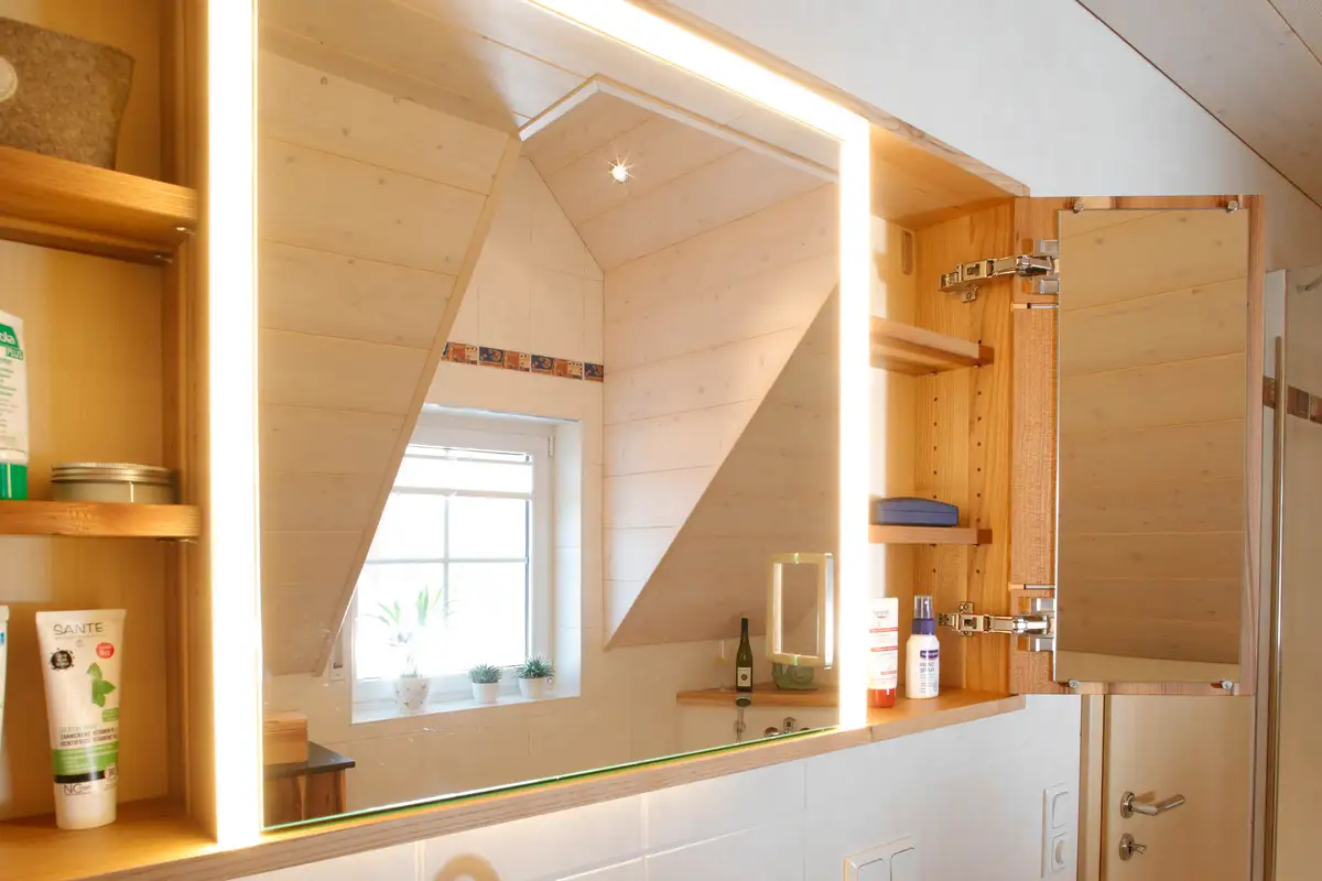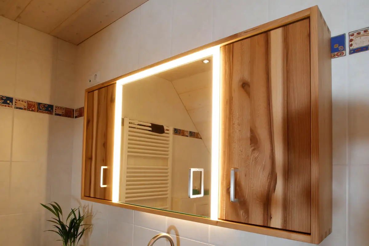 Erstaunlich: statt komplett verspiegelten Badzimmerspiegelschränken, wählen unsere Kunden zwar einen mittigen Spiegel, aber links und rechts hätten sie dann lieber wieder Holz. Schön, wenn man das einfach so machen kann, wie es den Kunden am besten gefällt.