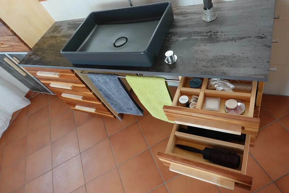 Badezimmer in Zwetschge und Wabenschrank aus Birne