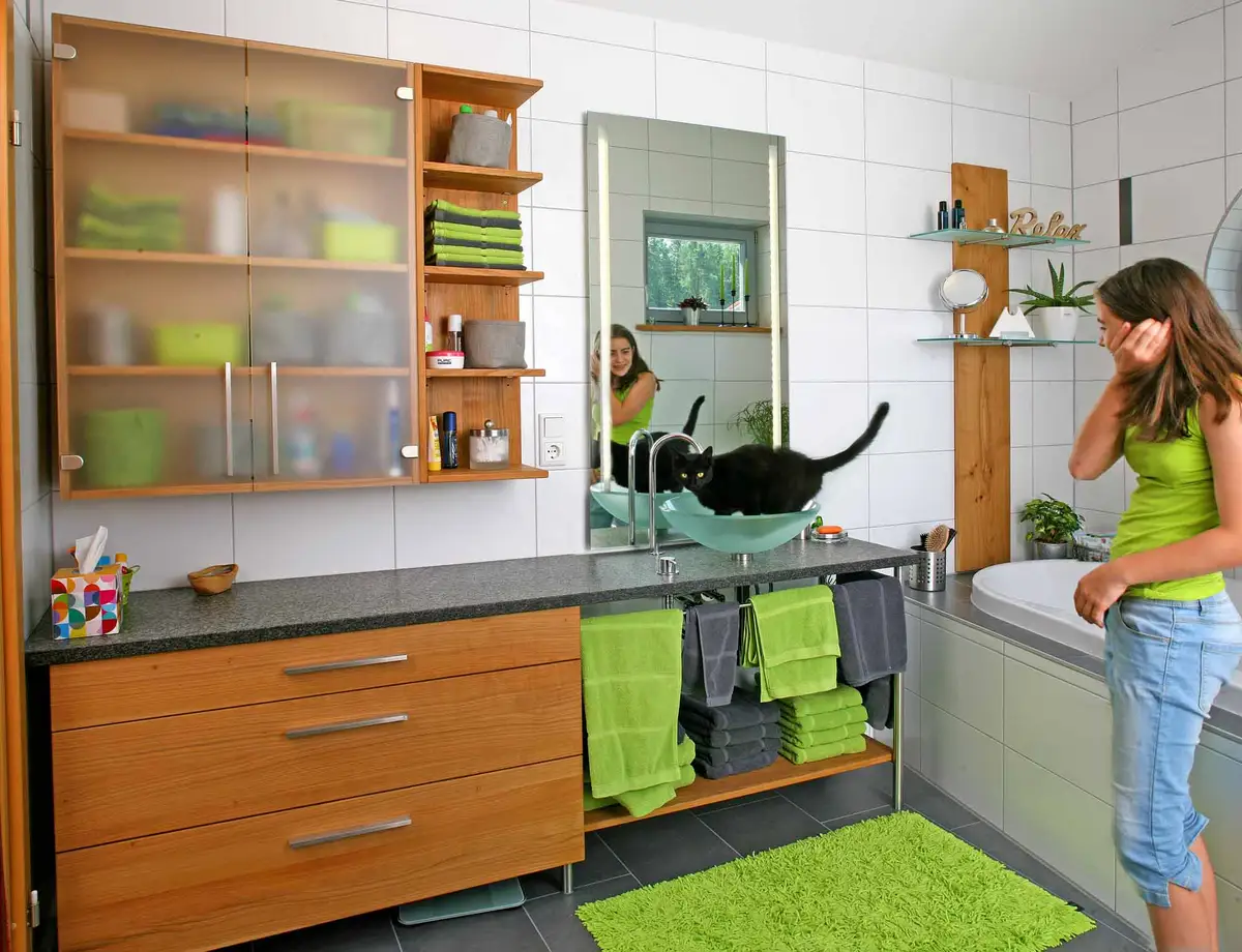 Badezimmer in Massivholz nebst Kater