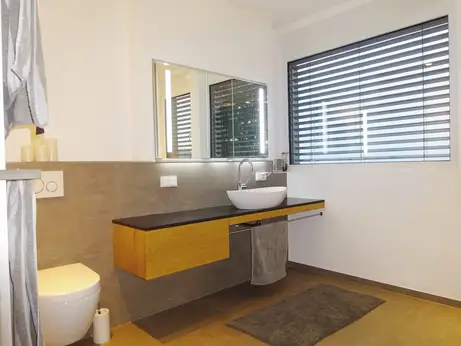 Das "Regionale Musterhaus" steht direkt neben der Möbelmacherhalle und wurde ausschließlich von Handwerkern und aus Materialien der Region gebaut. Gerne zeigen wir Ihnen auch das Badezimmer, das aus heimischer Buche mit Edelstahlwaschtisch und Lochblech in den Schrankfronten gestaltet wurde. Wir lieben die Holzbadewanne, die Solnofer Platten - sie bewähren sich auch in der Dusche - und die Armaturen von Vola.
