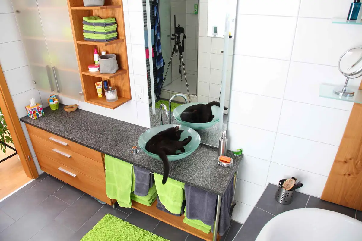 Als wir ganz nebenbei erfuhren, dass der Kater das Waschbecken so liebt, haben wir zusätzlich zur Familie Neubauer auch die Katze zum Modeln eingeladen.