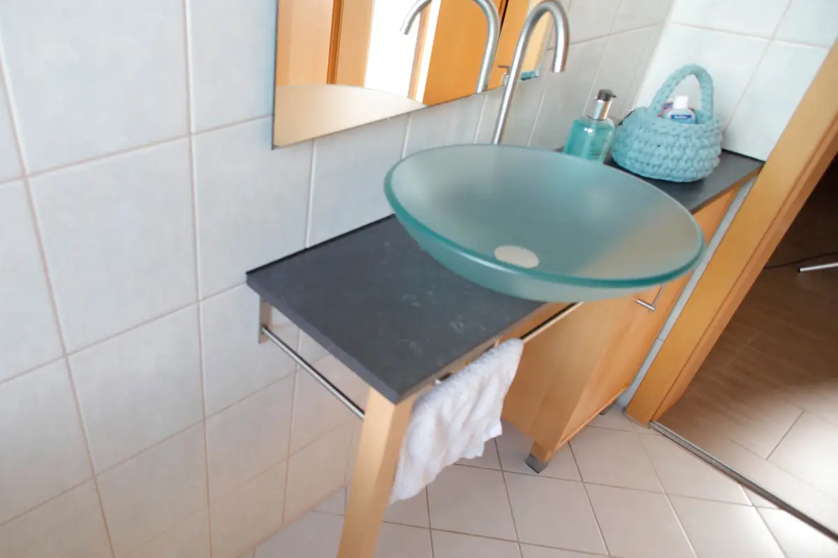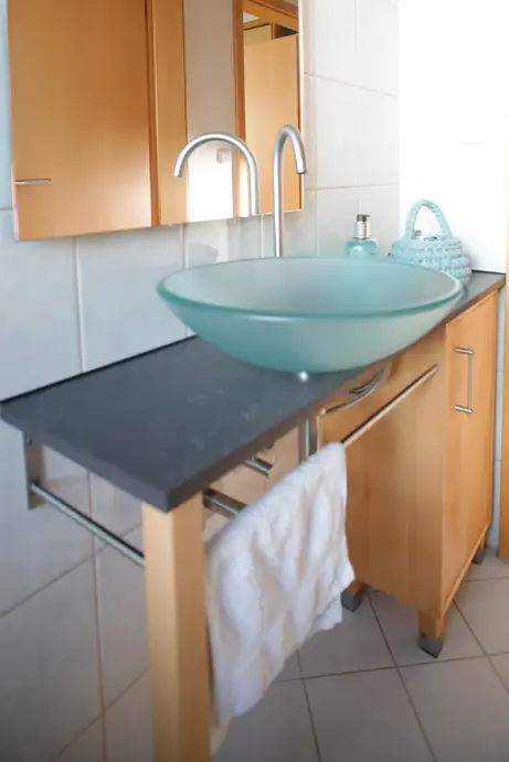 Die Platte des Waschtisches ist aus Granit, das Holz ist Thermobuche, die Schüsseln sind aus Glas und die Edelstahlreling ist in der Form das Waschtisches gebogen. Durch die Rundung des Waschtisches wirkt das Bad wesentlich geräumiger als bei einem Rechteck.