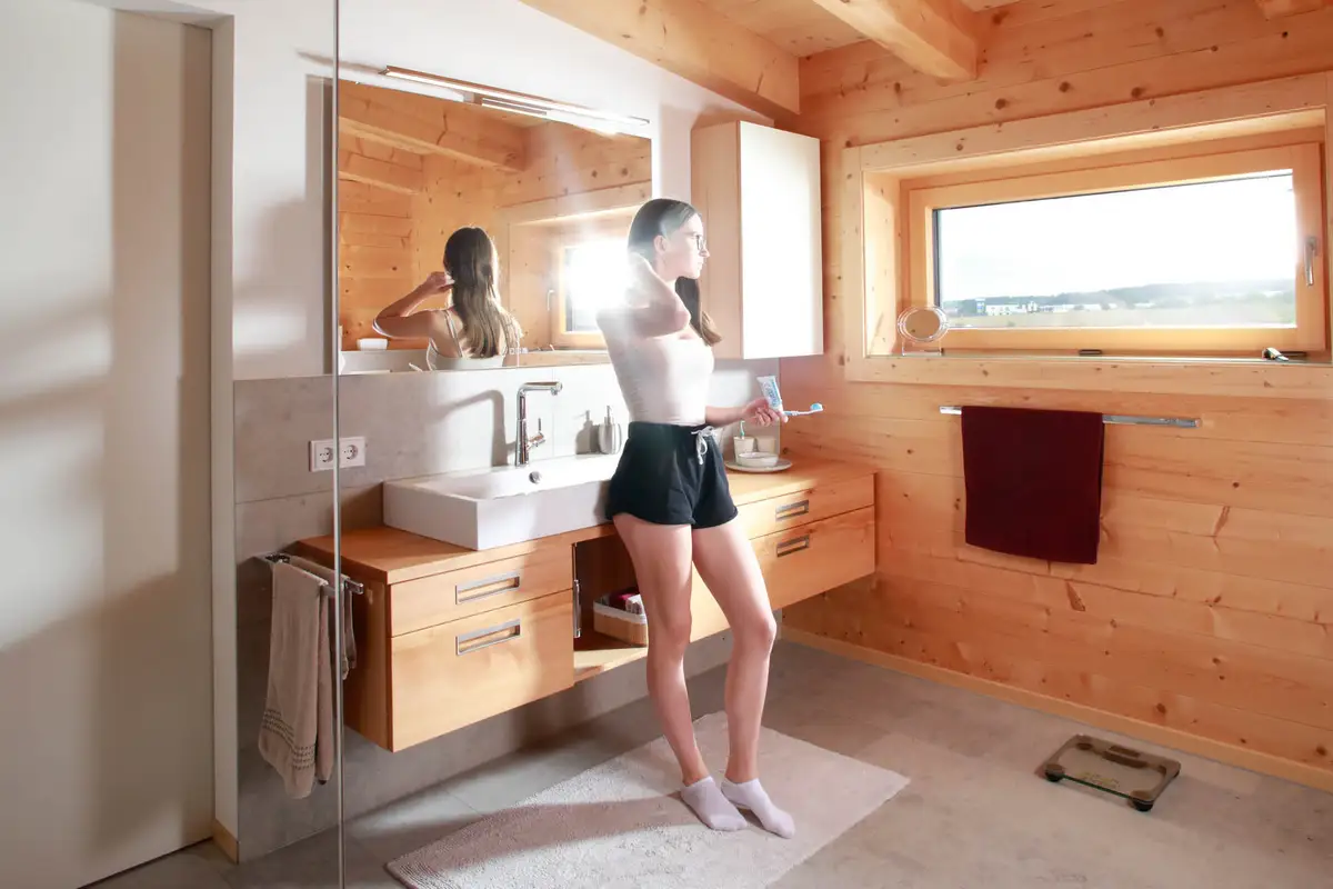 Massivholzbad mit Edelstahl im regionalen Musterhaus