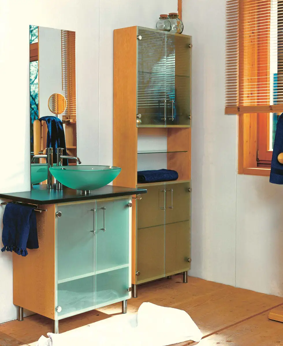 Der Badezimmerschrank besteht aus Buchen-Massivholz, Edelstahl und Glasfachböden