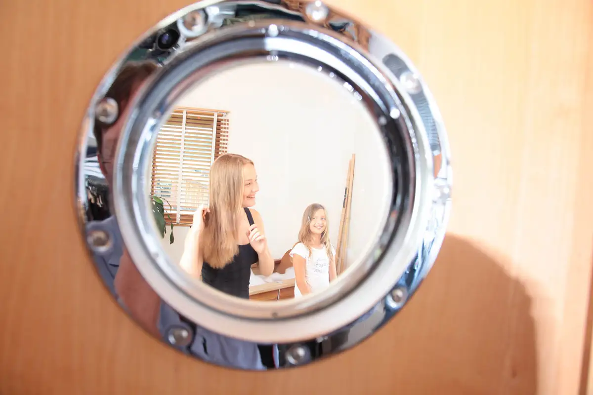 Innen auf der Holztür eingebaute Spiegel ermöglichen in Kombination mit der Doppelspiegeltür an der Mitte das Betrachten von hinten