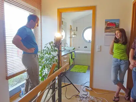 Das ist schon eine Herausforderung, ein nicht wirklich riesiges Badezimmer so zu fotografieren, dass sich der Betrachter ein realistisches Bild davon machen kann. Deswegen montierten wir zwei Fotos vom Tilt-Shift-Objektiv übereinander was aus dem 24-er Weitwinkel eine noch viel kleinere Brennweite macht, aber beim Zusammenführen von Gretas Beinen aus dem untern und den Haaren im oberen Bild dann wirklich aufwändig wird. Gleichzeitig zeichnen wir ein Video vom Fototermin mit Greta auf, die das Bad zusätzlich mit der Kugelkamera Pananono fotografiert hat