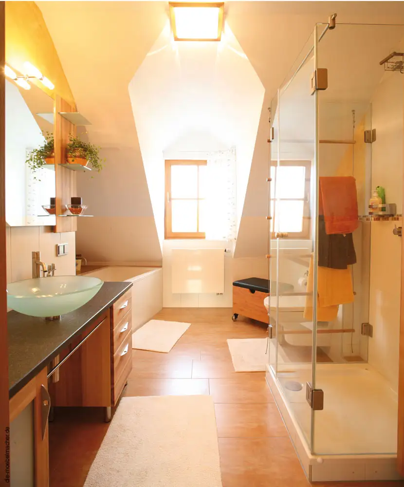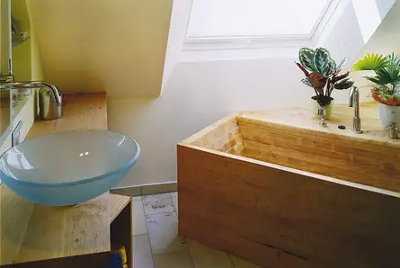 Kein leichtes Projekt war die Holzbadewanne aus Erle, aber sie ist rundum gelungen. Zusammen mit kräftigen Helfern baute Stefan diese kubistische Wanne, die unter dem Dachflächenfenster einen Logenplatz zum Sternegucken bietet. Der Waschtisch aus Holz trägt die Glasschüssel von HighTech.