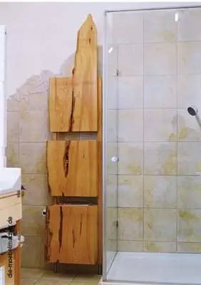 Der Schrank neben dem WC nimmt die freie Form der Fliesenkante durch die Tür aus dem geteilten Brett wieder auf.