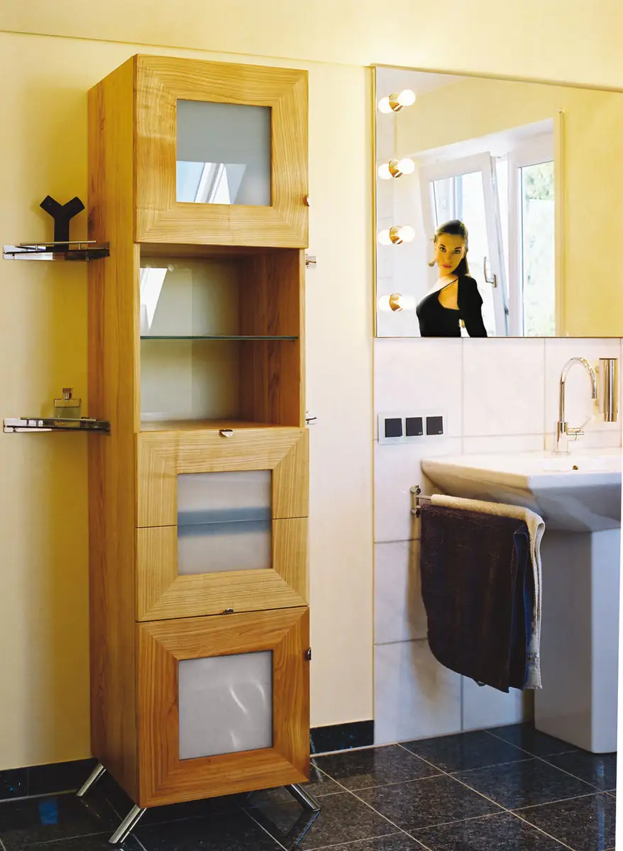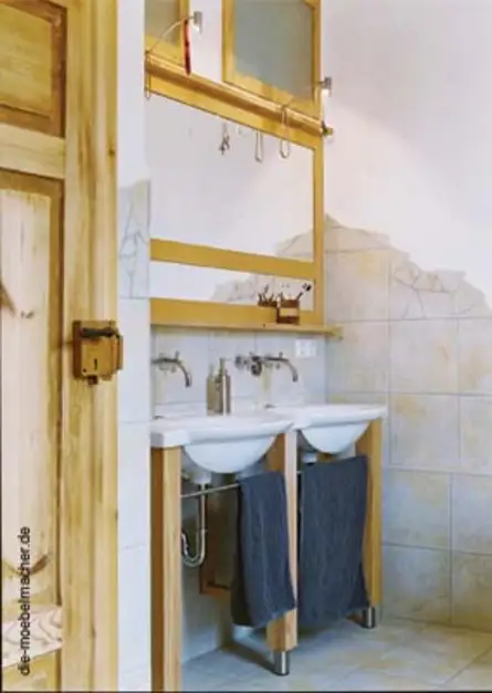 Das Umweltamt der Stadt Erlangen hat für Ihr Elsbeeren-Förderprojekt eine Laufzeit von 40 Jahren angesetzt - und auch da wird das Bad von Familie Eberlein immernoch wie neu aussehen, nur ein bisschen dunkler wird sie werden, die Elsbeere. Die Granitplatte ist geflammt und gebürstet, die Glasschüssel von Hightech, die Armaturen von Vola und die praktische Strickleiter aus Eigenproduktion.