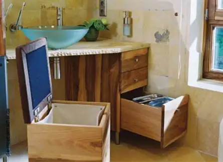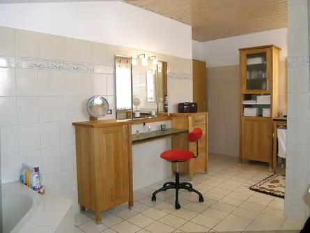 Das Bad, in dem sie steht, ist aus Nussbaum, der bei den Tür- und Spiegelrahmen noch die Baumkante behalten hat. Passend dazu sind auch die Solnhofer Platten der Firma Gösswein aus Oberkrumbach, die mit "angeknabberter" Kante verlegt wurden. Die Innenseite des Fensters ist aus dem gleichen Nussbaum wie die Möbel. Die Schreinerei Seitz aus Weigendorf machte es möglich. Die Jalousie von Ann Idstein ist ebenfalls 'ne harte Nuss. Der Wäschepuff zum Rollen und Sitzen und der Abfallbehälter im Schub aus dem Gastronomprogramm machen dieses außergewöhnliche Bad nicht nur optisch attraktiv.