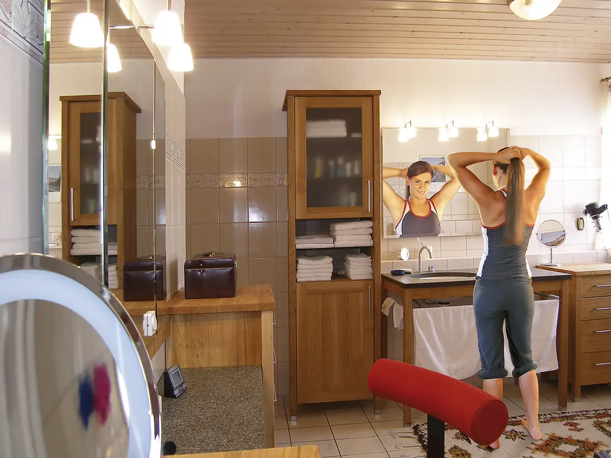Das Kirschbaum-Granit-Glas-Bad in Winkelhaid hat Jana Münzenberg nie gesehen. Sie wurde von Peter Jirmann jr. dort einfach einmontiert. Jana trägt ihre Lieblingsklamotten, mit denen sie auf Platz eins der bayerischen Meisterschaft im Schwierigkeitsklettern geklettert ist.