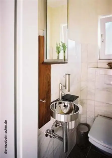 Die Nussbaumdetails im Gäste WC geben nicht nur der Optik den letzten Schliff sondern decken auch Installationen ab. Edelstahlbecken mit Granitablage und Mischbatterie "Marathon", Spiegel mit Edelstahlrahmen, Edelstahltreteimer, Seifenspender: alles von Hightech!