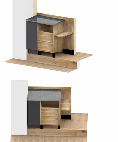 Hochfaltklappe nach oben und Schübe unten, dazwischen die Servierklappe zum Mixen