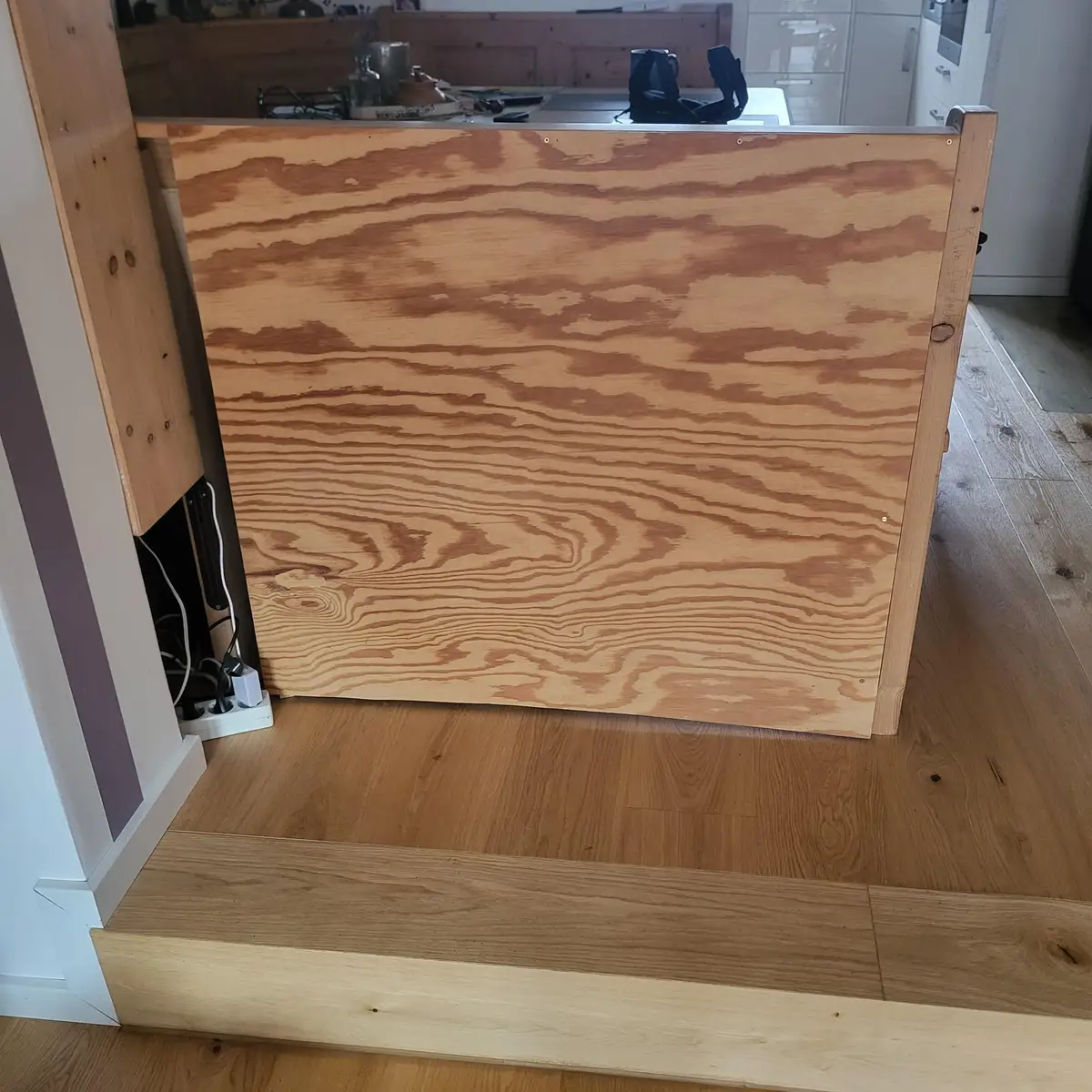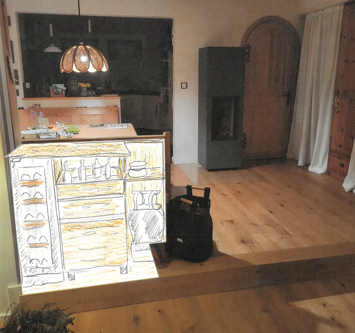 Unsere Kunden aus dem Landkreis Augsburg haben unser Stehpult auf unserer Homepage entdeckt uns sich ein hübsches abgeholt. Etwas später kamen sie dann auf die Idee, dass wir ja auch die unschöne Rückseite ihrer in den Raum schauenden Rückseite der Eckbank raffiniert verkleiden könnten. Aber nicht nur verstecken, sondern mit Weinkühlschrank Barschrank und einer Rückwand für den Holzkorb.