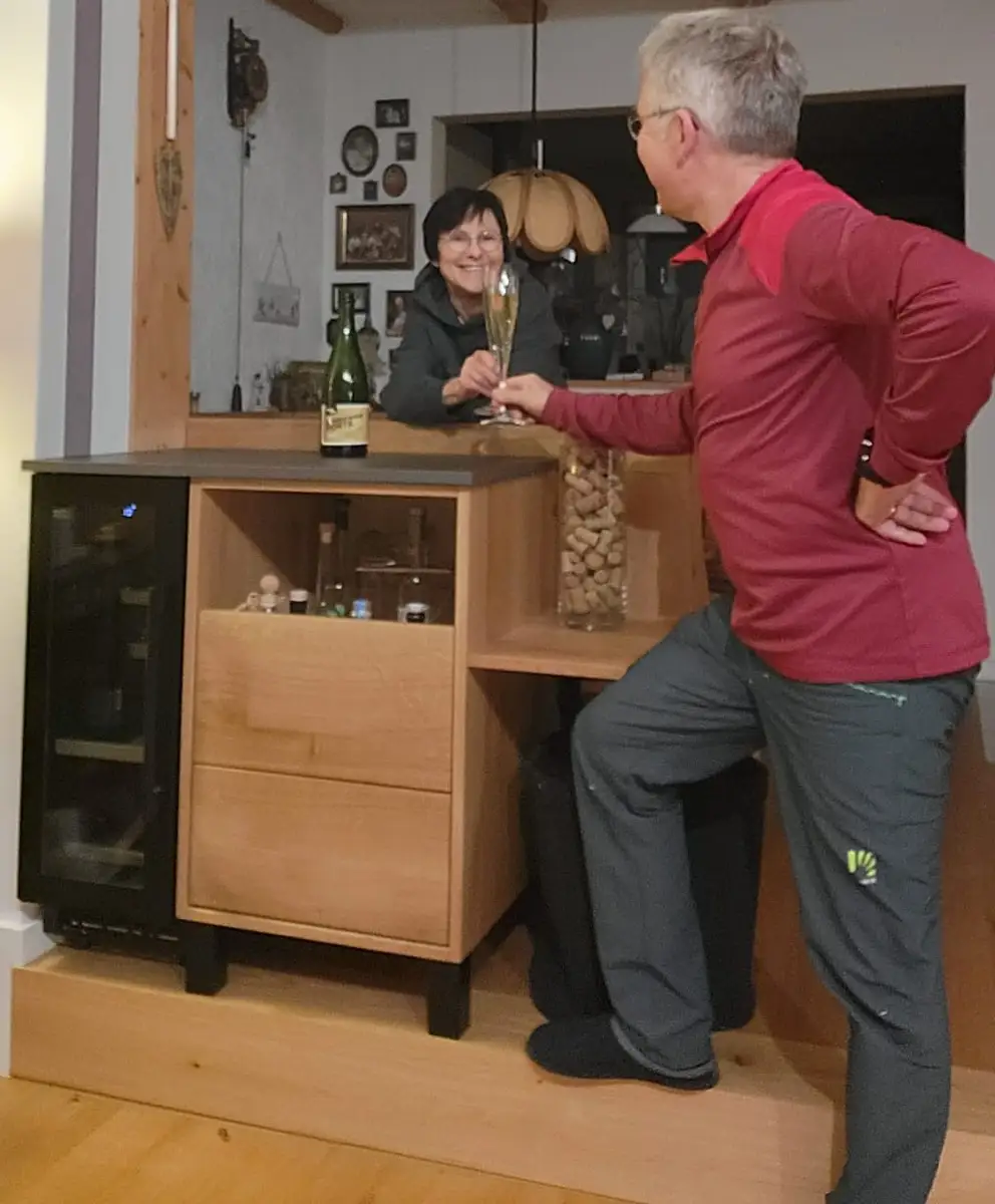 Die Idee zu diesem Schrank aus massiver fränkischer Buche entstand erst im gemeinsamen Gespräch, aber herausgekommen ist ein perfekt ausgestattetes Möbel für professionelle Mixer, denn Heike hat das einst sogar gelernt. Die ganze Geschichte drumrum ist im Blog nachzulesen, im Video sieht man alle Funktionen und warum so ein Barschrank richtig Freude macht: