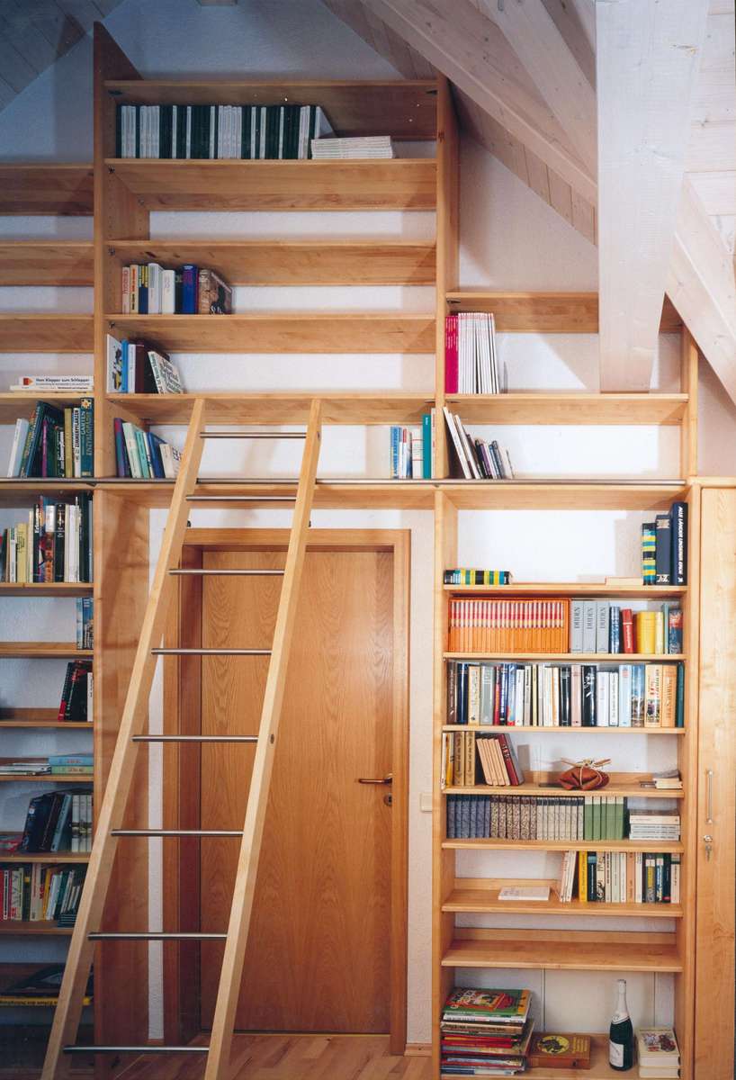 Schon oft konnten wir im Gang, im Treppenhaus, im Verbindungstrakt oder bei Oma noch Stellen entdecken, die das Wohnzimmer buch-technisch entlasten und den neugefundenen Regalplatz zur Bibliothek werden lassen. Verschiebbare Leitern machen auch große Höhen zugänglich und unsere Einzelanfertigung ermöglicht – wenn 's unbedingt sein muss – sogar die Unterbringung des Staubsaugers. Die Anschlagleisten auf der Rückseite der Fachböden machen den Fachboden und das ganze Regal nicht nur stabiler, sie verhindern auch das „An-die-Wand-knallen“ der Bücher, zum Schutz der Wand und zum Schutz der Bücher.