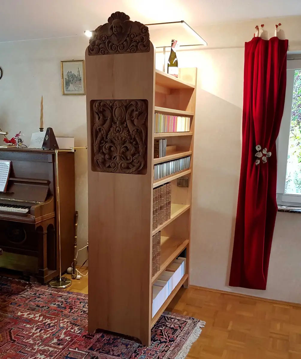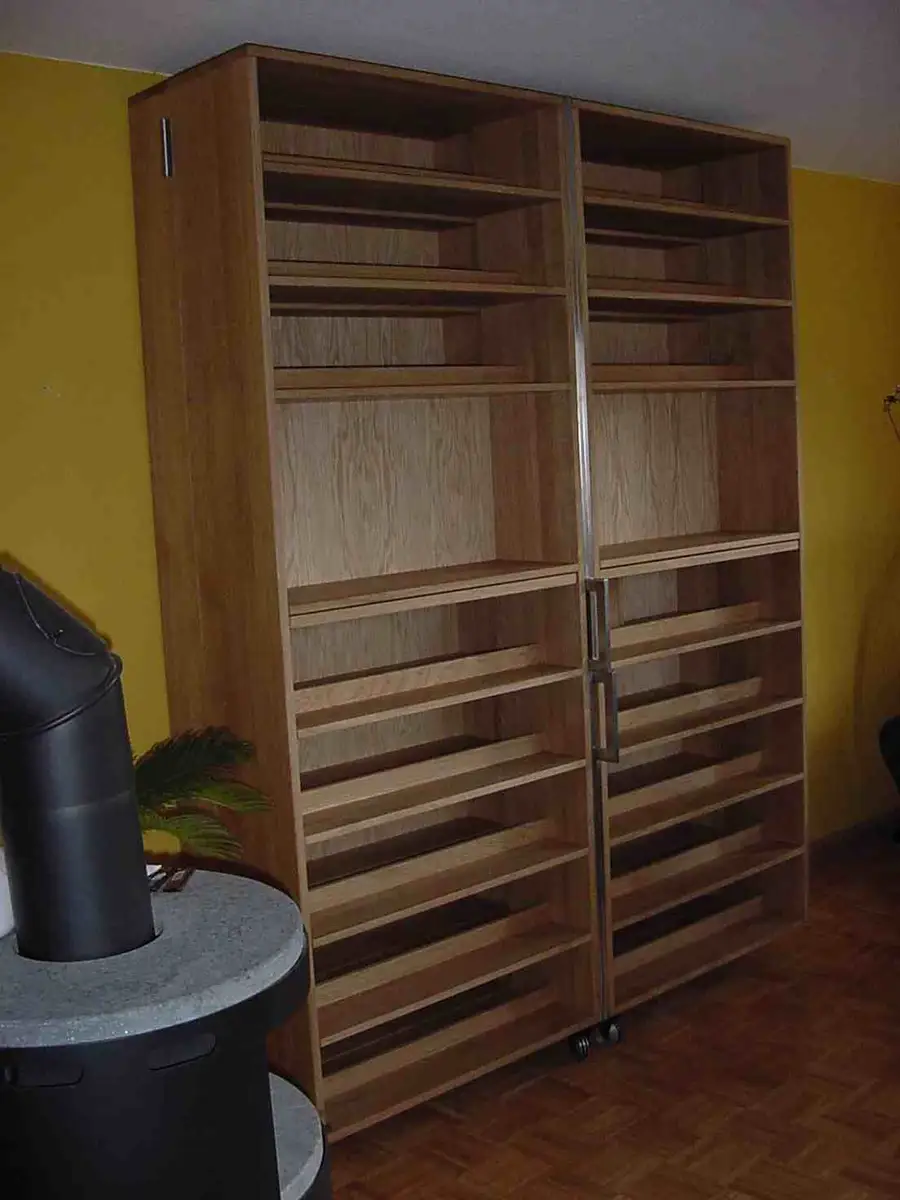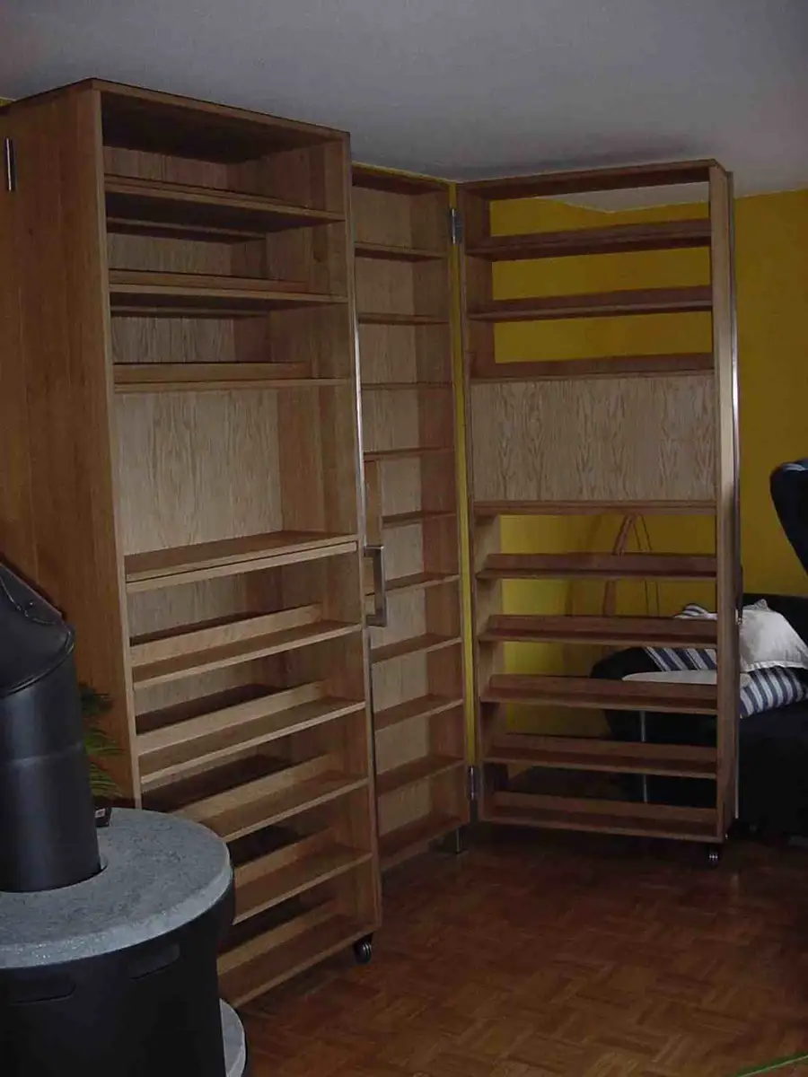 „Zwanzig Jahre ist mein Möbelmacher-Bücherschrank nun alt. Er ist das einzige Möbelstück, das wir je haben schreinern lassen. Das einzige, dass ich stolz „vorführe“: „Hier kann man ihn öffnen, er hat drei Ebenen … (die Schwenkrollregale sind beidseitig bestückt), da ist das Whiskyfach, hier lassen sich Laden zum Ablegen von Büchern herausziehen …“. Er ist mein wertvollstes Möbelstück. Meine Idee und das redliche Handwerk, die in ihm stecken, die Bücher, die ihn zeitweilig oder länger bewohnen dürfen und unbedingt das Wissen um den nachhaltigen Ansatz der Möbelmacher.