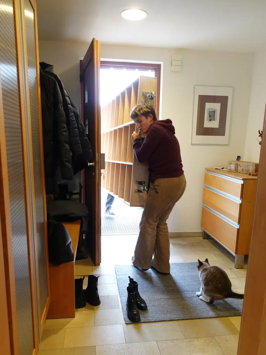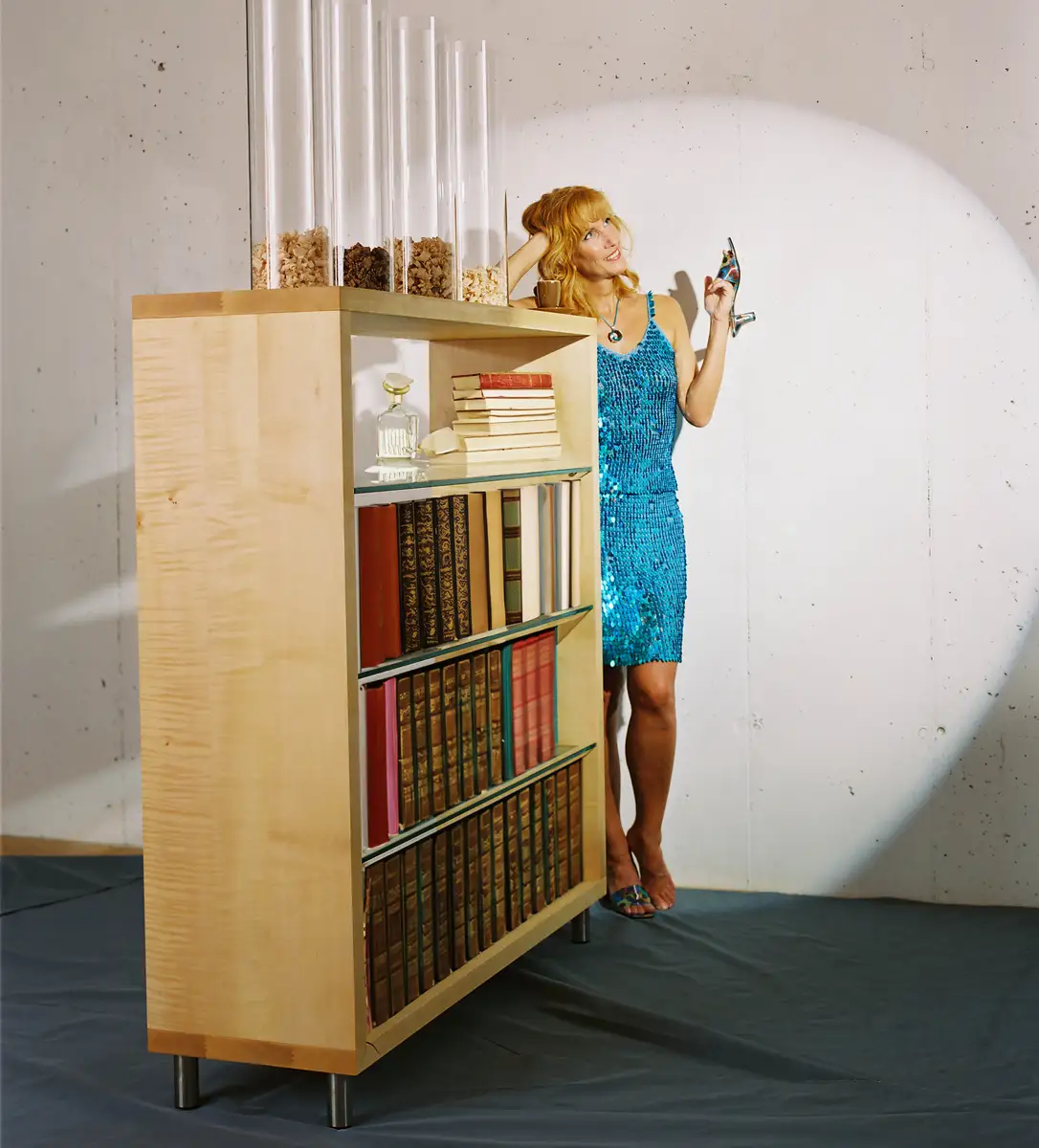 Heute steht das Regal schon voller Bücher und deswegen haben wir das „Schdabferla” (fränkisch für Stufe) gleich mit in den Schubschrank integriert. Damit kommt auch Model Sabrina auf die oberste Ablage, die durch den Trick der drei in Edelstahl eingehängten Korpusse ein raffiniertes und funktionales Spiel mit der Möbeltiefe zulässt. Der Auszug trägt übrigens nicht nur Sabrina zur hohen Literatur, was bei Ihrem Gewichtchen keine Kunst ist, sondern auch schwere Jungs.