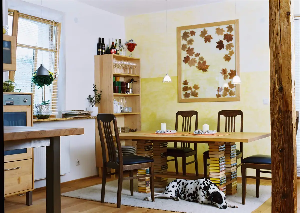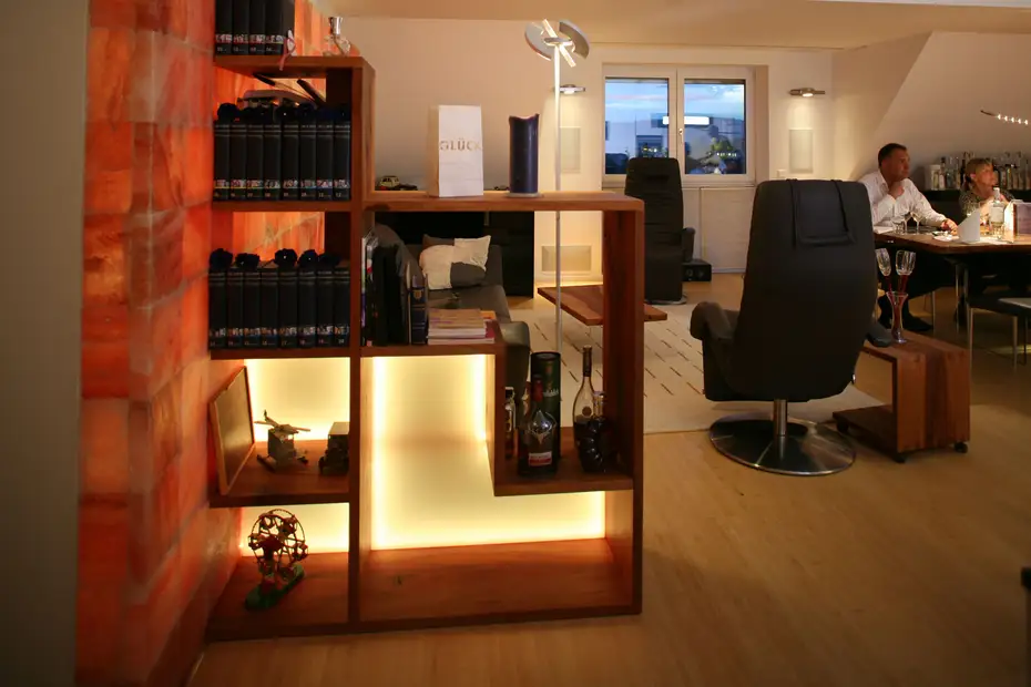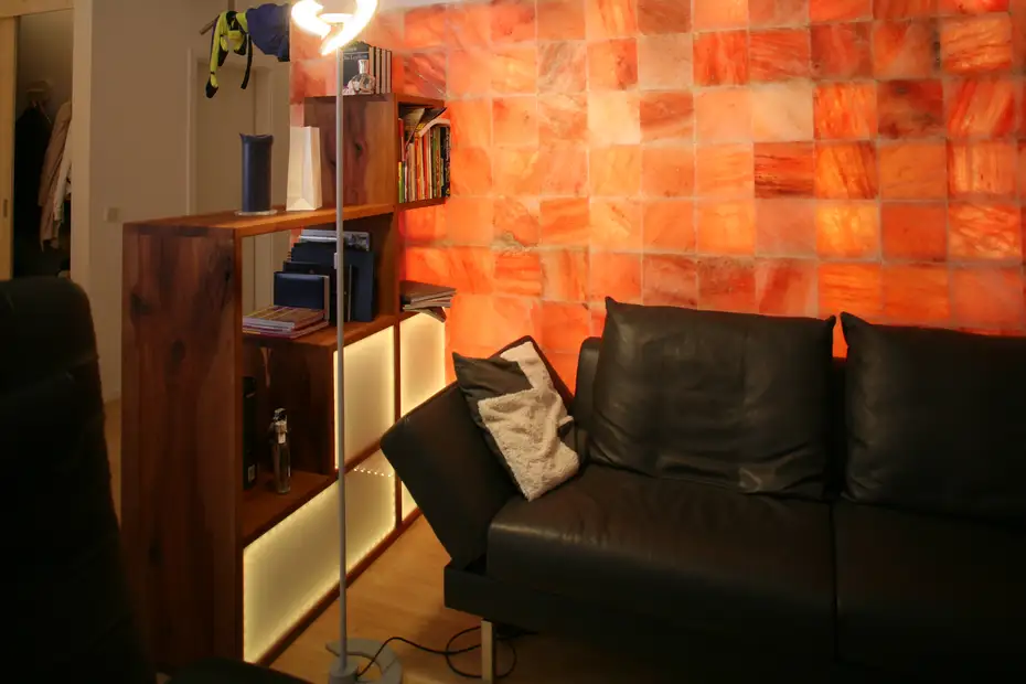 Raumteiler aus Birnbaum an Salzwand mit weißer Glasrückwand