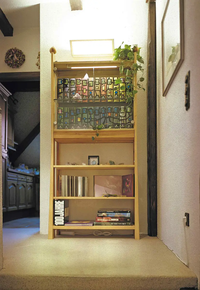 Weil es in jener Küche an Platz für hunderte von Kochbüchern fehlte, kreierten wir ein Regal neu, dessen erste Verwirklichung sich bis ins Jahr 1988 zurückverfolgen lässt. Unterschiedliche Hölzer werden wie Bücher gefräst und dienen als statisch und statistisch verlässlicher Halt von hunderten von Büchern und Kilo.