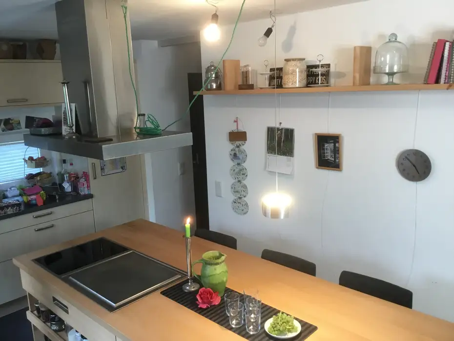 Weil man gleichzeitig an der frisch gestrichenen Wand Kinderbilder nicht mehr mit Tesafilm anbringen wollte, haben wir eine Schiene integriert, in die man die üblichen Galerie-Bildaufhänger überall einhängen kann. Die Reste des Nylonfadens rollt man normalerweise hinter dem Bild ein, aber wir haben wegen der Drucklegung dieses Buches so gedrängelt, dass wir auch so schon sehr dankbar für dieses Foto sind.