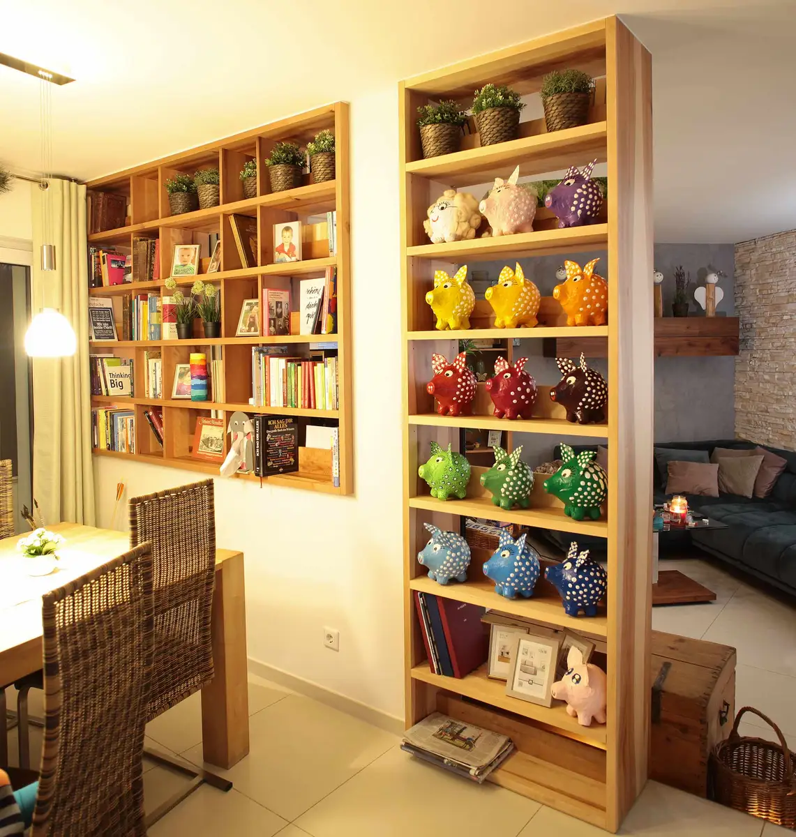 Bücherregal als Raumteiler, das auch Schweinen gegenüber aufgeschlossen ist