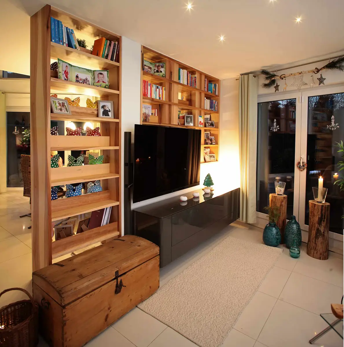Zweiseitig nutzbares Bücherregal aus Elsbeere als Raumteiler eingebaut