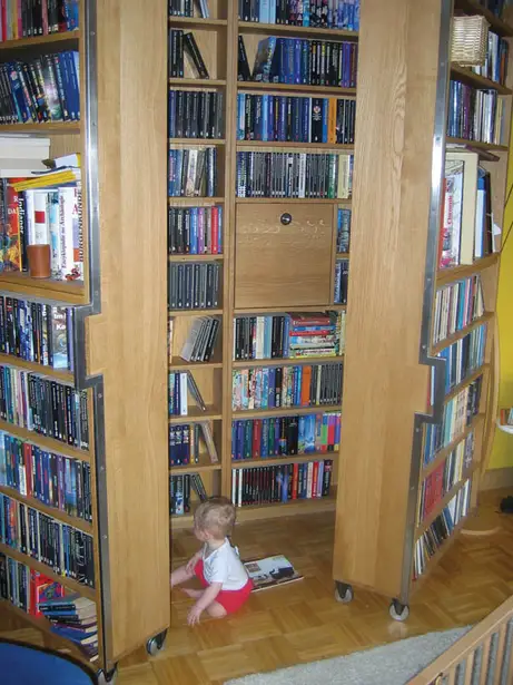 Die ausfahrbaren Regale sind außer der Mittellage für gebunden Bildbände beidseitig mit Taschenbüchern bestückt