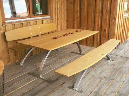 Bank und Tisch aus Eiche mit Edelstahlarbeiten von der Schlosserei Lindner