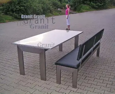 Tsich aus Edelstahl und Granit, Bank aus Edelstahl mit Lederbezug