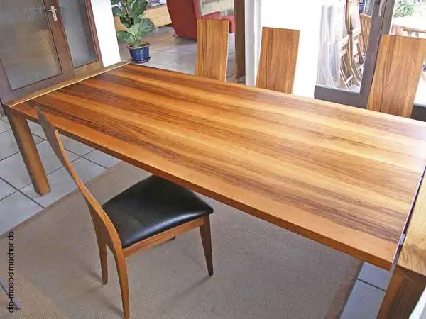 Dieser Tisch kam auf der Consumenta so gut an, dass wir ihn hier ausnahmsweise nur mit wenigen Nussbaumstühlen zeigen. Die Platte schwebt auf einem, zwischen den beiden U-Gestellen montierten, Edelstahlrahmen. So hat man keine Krümel in den Fugen und die massive Platte kann im Sommer größer, im Winter kleiner werden. Wir haben auf Kundenwunsch die gewünschte Optik mit den physikalischen Notwendigkeiten der Massivholzverarbeitung verbunden.