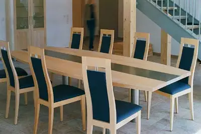 Zur Kölbl-Küche mussten natürlich auch Tisch und Stühle passen. Unser neues Stuhlprogramm mit kleiner Edelstahleinlage kam da gerade recht.