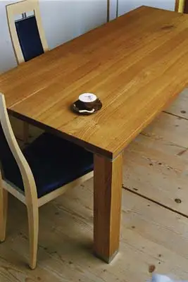 Weniger geht schon fast nicht mehr. Der Tisch hat nur Platte, zwei massive Wangen und eine Traverse dazwischen.