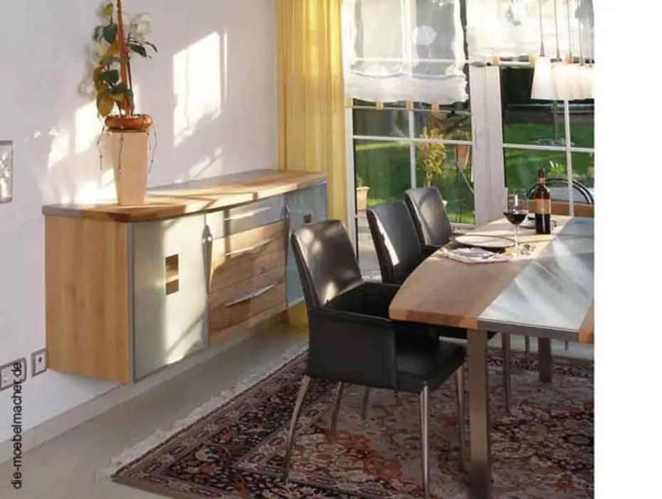 Dazu das passende Hängeboard mit der gleichen Einlage und einer Schubladenfront aus Holz und Edelstahl. Die Stühle Mikono mit oder ohne Armlehnen aus der Diners Serie von Jori sind immer noch die einzigen, die dank ihrer Herkunft aus einer Polstermöbelfabrik bisher ungeahnten Sitzkomfort bieten.