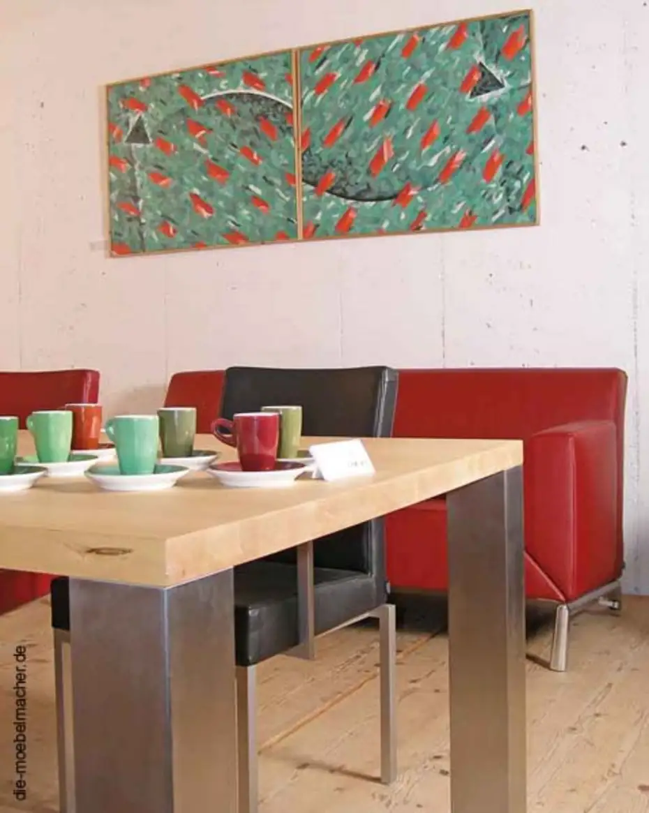 Die Edelstahlplatte von Franke hat einen unempfindlichen Wirbelschliff, das eingerückte Gestell aus Edelstahlrundrohren lässt auf allen Plätzen optimale Beinfreiheit zu. Die passenden Ahorn-Edelstahlstühle sind praktischerweise ledergepolstert.