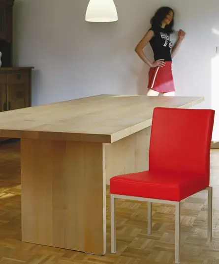 Ahornessplatz mit konischen Beinen und dem neuen Stuhlmodell von Hainke