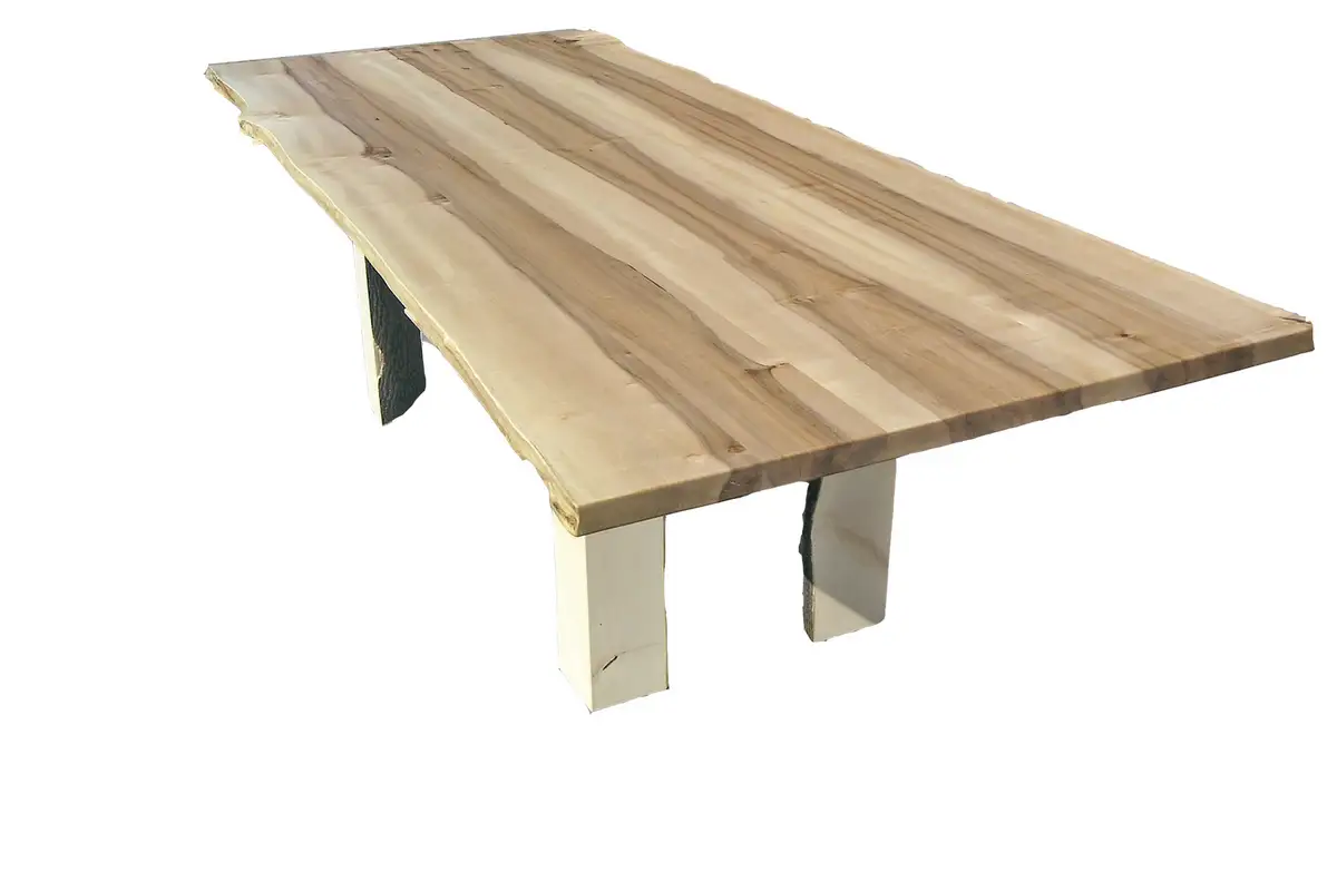 Tisch aus Ahorn mit Baumkante, Tischbeine aus gevierteltem Ahornstamm.