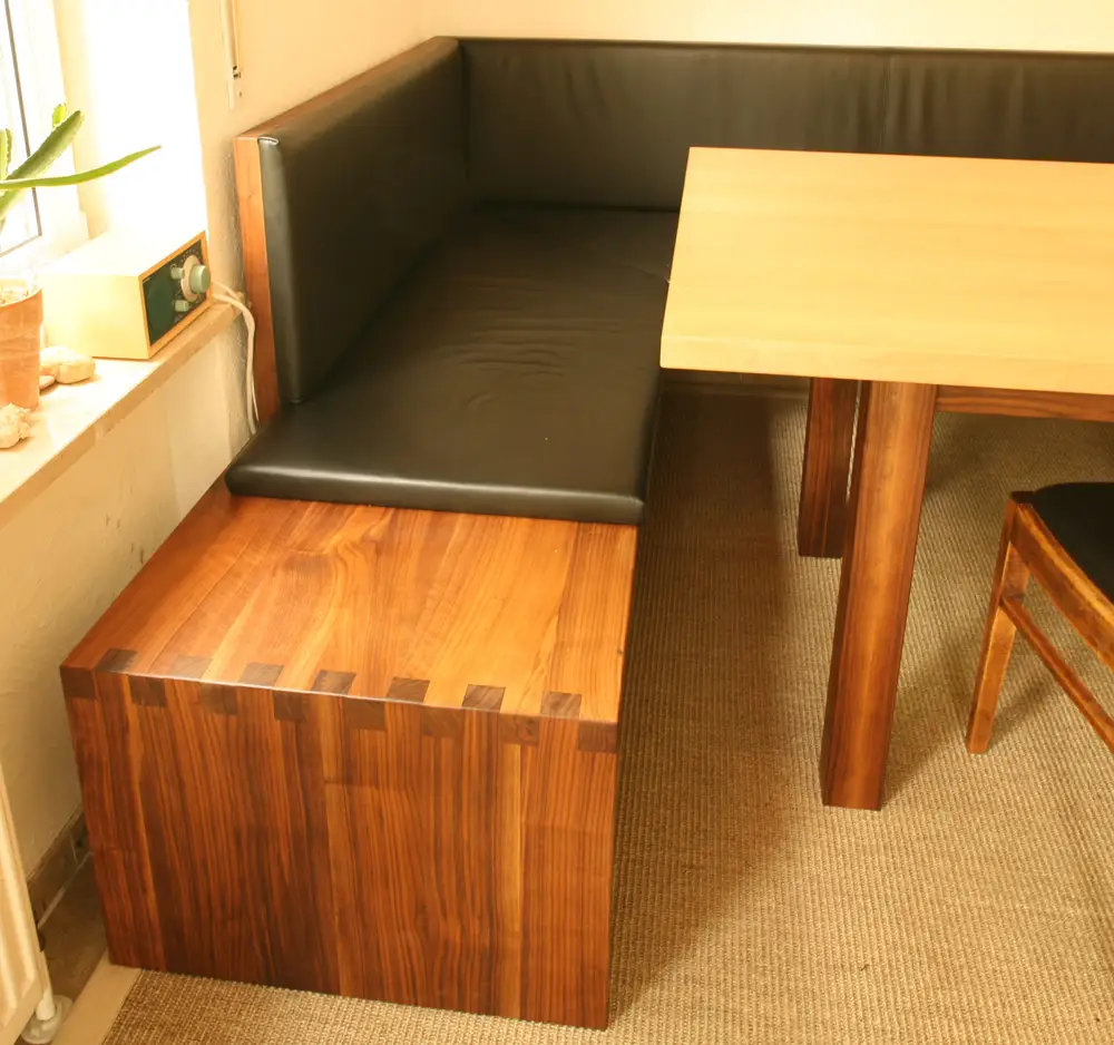 Unsere Eckbank aus Nussbaum spielt im Gegensatz zu vielen anderen Banken nicht mit gezinkten Karten, sondern ist mittels "Fingerzinken" (so der Fachbegriff für die handwerkliche Holzverbindung) verbunden. Das Polster wurde auf Kundenwunsch nicht ergonomisch gemütlich, sondern eher wie ein Chorstuhl gestaltet. Trotzdem gehen die Gäste angeblich nicht heim.