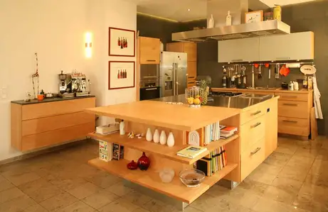 Die Eckbank ist für viele Menschen das Symbol der Gemütlichkeit. Wenn genug Platz ist, dass der Tisch eine vernünftige Länge (so ab 2 Meter) bekommt, dann ist er auch mit Gästen eine wahre Freude. Hier wurde Nussbaum mit schwarzem Leder und Ahorn kombiniert, weil der heimische Ahorn schon in der Küche zum Einsatz kam.