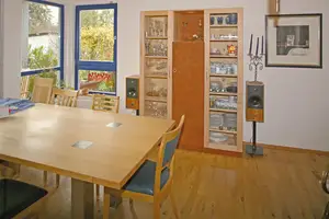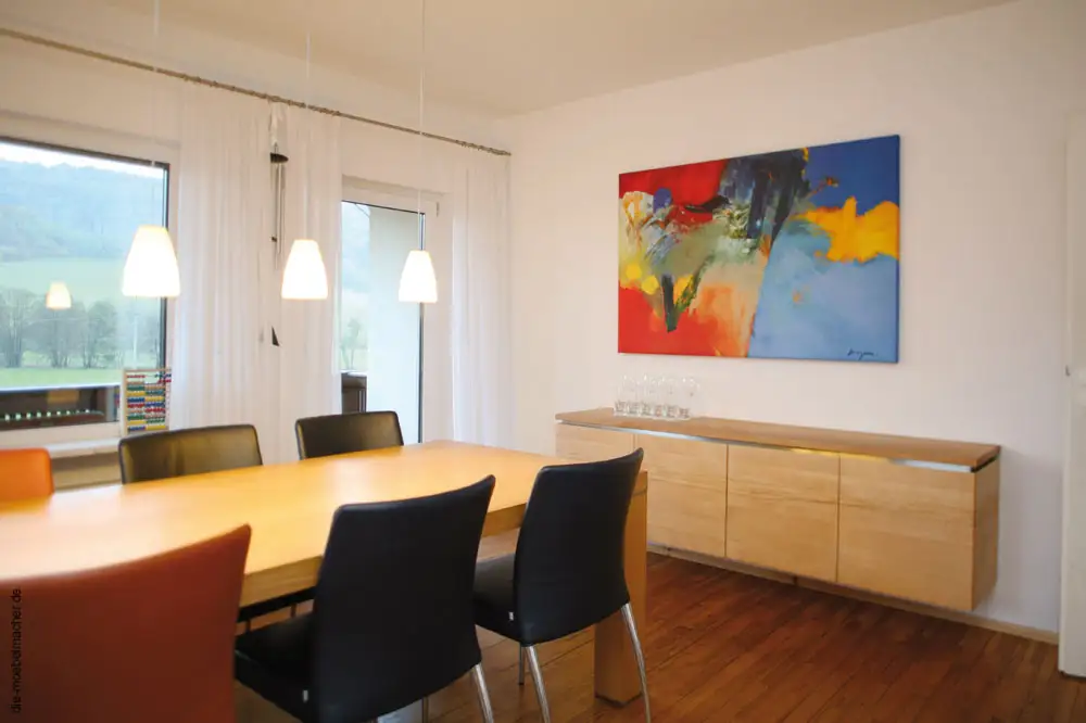 Nussbaumboden, Ahornmöbel mit Beleuchtung und die Mikono Vollpolsterstühle von Jori machen aus dem großen Zimmer einen gemütlichen Wohnraum. Die Granitplatte auf dem Sideboard eignet sich hervorragend als zusätzliche Abstellfläche, und der Fernseher ist durch seine Rückwand und das Licht nicht ganz so dominant.