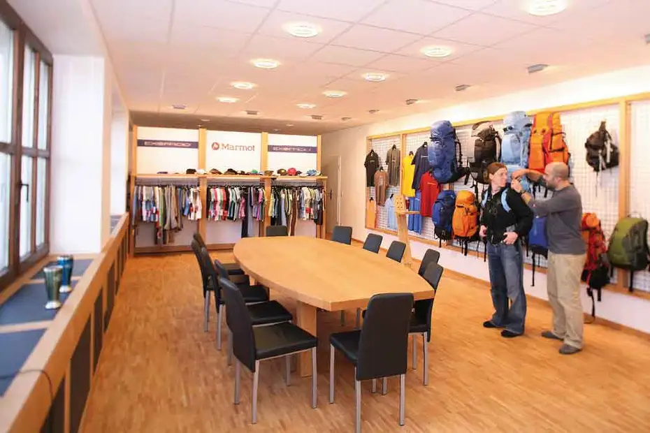 Eigentlich gehört der Beratungsraum von Marmot Deutschland in Schnaittach ja zu der Marmot-Objektsonderseite, aber weil so ein schöner Konferenztisch drauf ist, der auch als Esstisch nicht häßlich wäre, zeigen wir ihn auch hier. Und den Rest der Ladeneinrichtung haben wir in der Zwischenzeit in genau der gleichen Ausführung Buche-Edelstahl auch nach England geliefert.