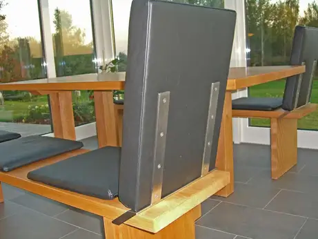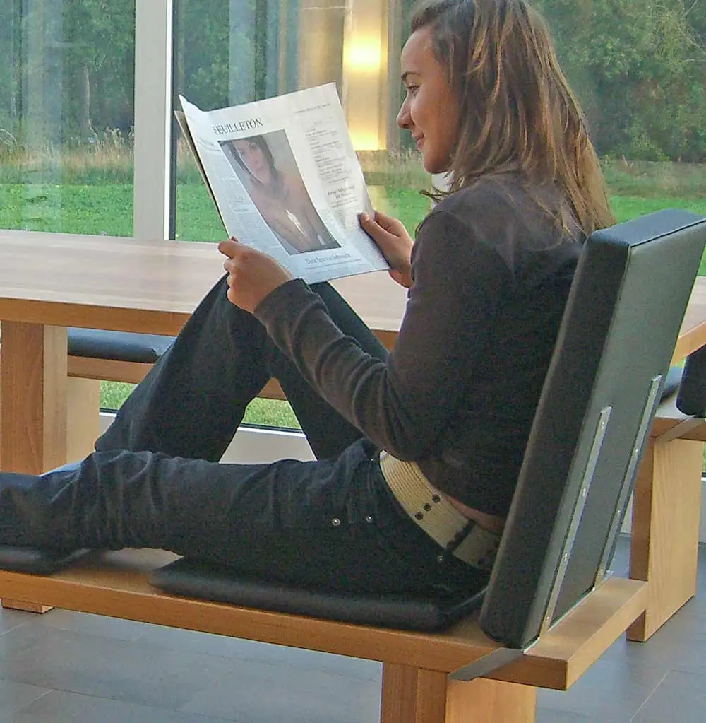 Natürlich kann man auch beide Tische zusammenschieben, wenn Gäste kommen. Die Aufschiebelehne für Carinas Bank verstellt nicht den Blick in die Natur und schafft trotzdem einen sehr bequemen Leseplatz. Die Vollpolsterstühle Mikono