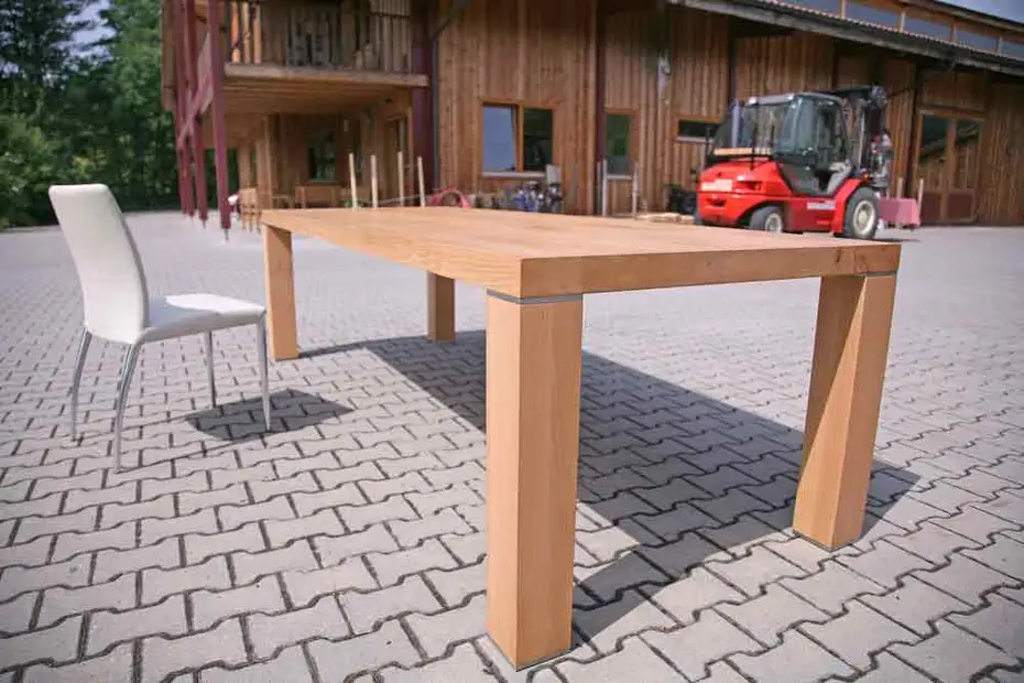Das Edelstahlprofil des Tischbeines ist 4 mal 10 cm dick und direkt auf eine Montageplatte geschweist, die wir wiederum unter die nur 3 cm starke geölte Massivholzplatte schrauben. Dafür, dass das alles ohne Verziehungsprobleme funktioniert, haben wir die Bäume im Wald gekauft, bei uns auf der mobilen Säge zu Brettern geschnitten, einige Jahre gelagert, getrocknet und gewissenhaft verarbeitet.