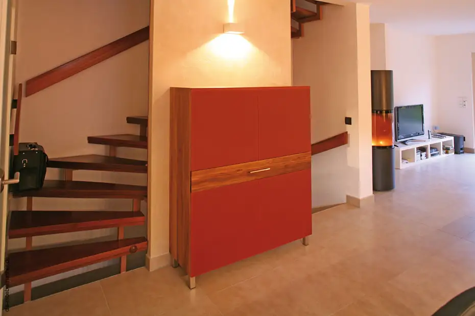 Auch der Blick zurück auf die Treppe wird von dem Rot der Joristühle attraktiv begleitet