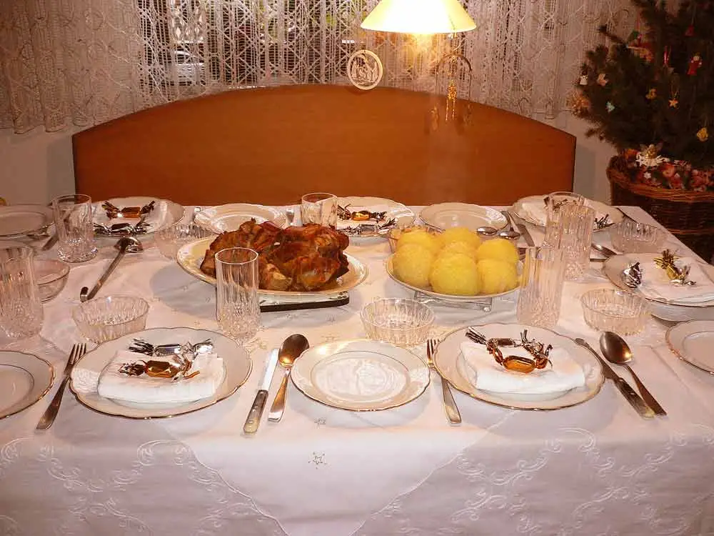 Festlich gedeckt wird aus einem Massivholztisch eine edle Tafel