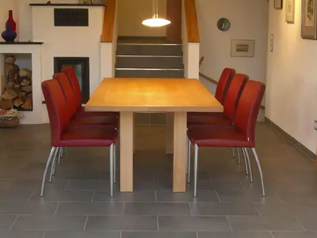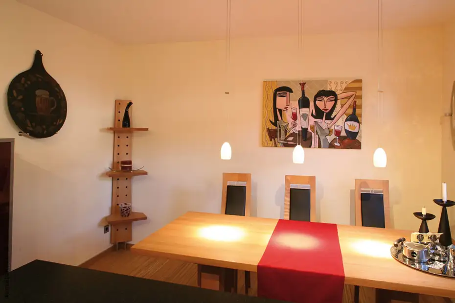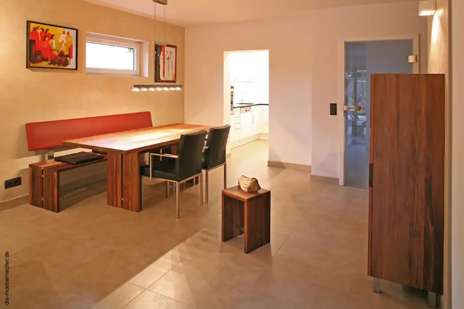 Familie Besser suchte eine neues Wohn- und Esszimmer und macht damit ihrem Namen alle Ehre. Der dunkle Nussbaumboden ist ein schöner Kontrast zum hellen Ahorn und die roten Jori Vollpolsterstühle machen jeden Abend